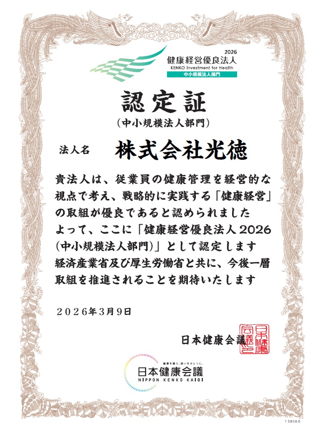 健康経営優良法人2026(中小規模法人部門) 2026年3月30日/カテゴリ: お知らせ /作成者: gtwaa974hwtty「健康経営優良法人2026(中小規模法人部門)」に認定されました 社員が健康で楽しく安心して働くことができるよう、健康づくりを推進してまいります https://kotoku-group.com/wp-content/uploads/2026/03/タイトルなし-1.jpg 191 238 gtwaa974hwtty https://kotoku-group.com/wp-content/uploads/2023/11/logo.png gtwaa974hwtty2026-03-30 14:51:532026-03-30 15:38:12健康経営優良法人2026(中小規模法人部門)